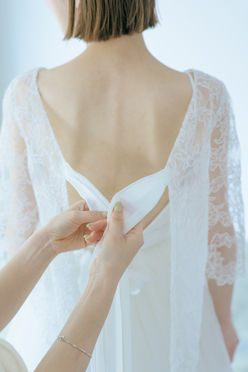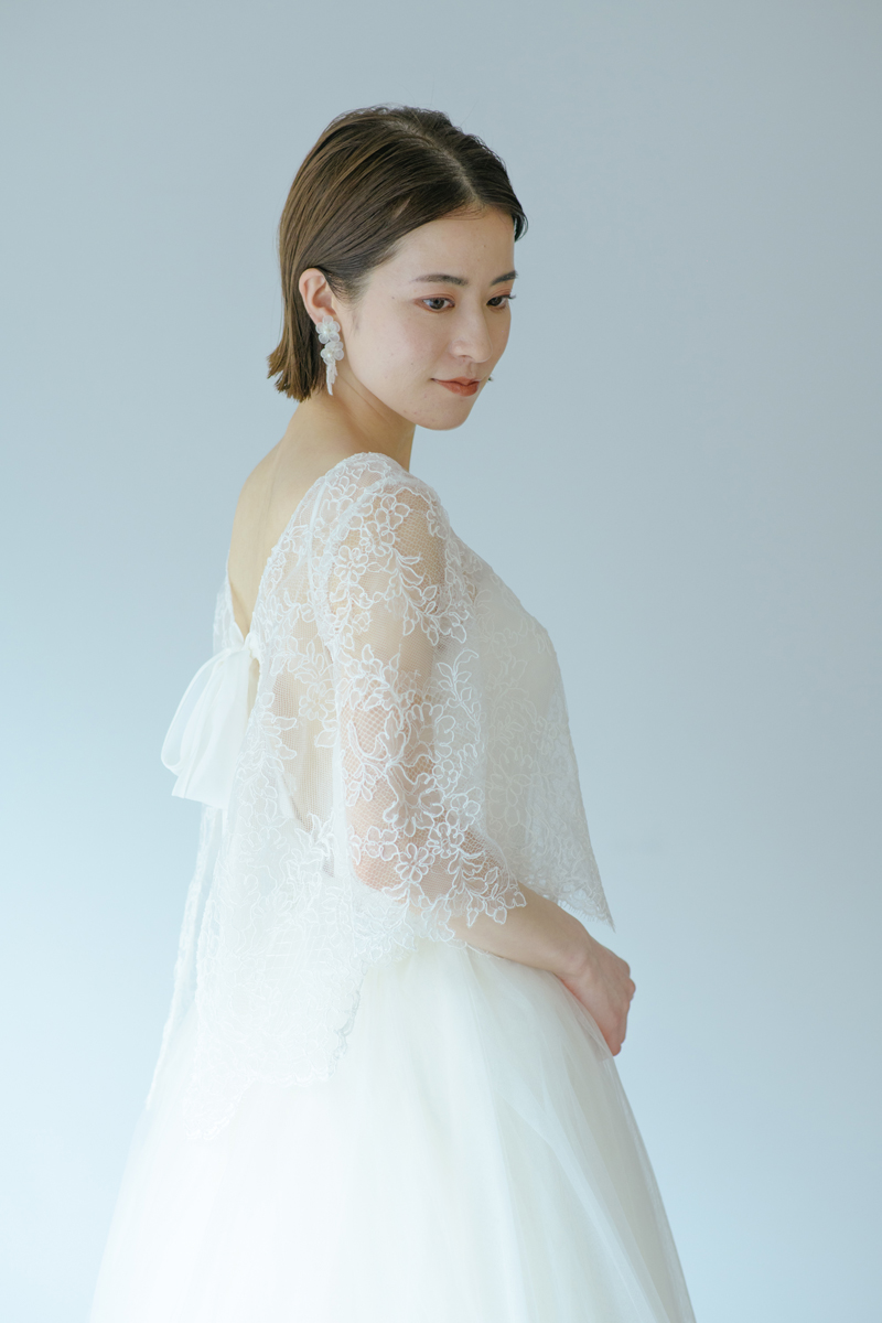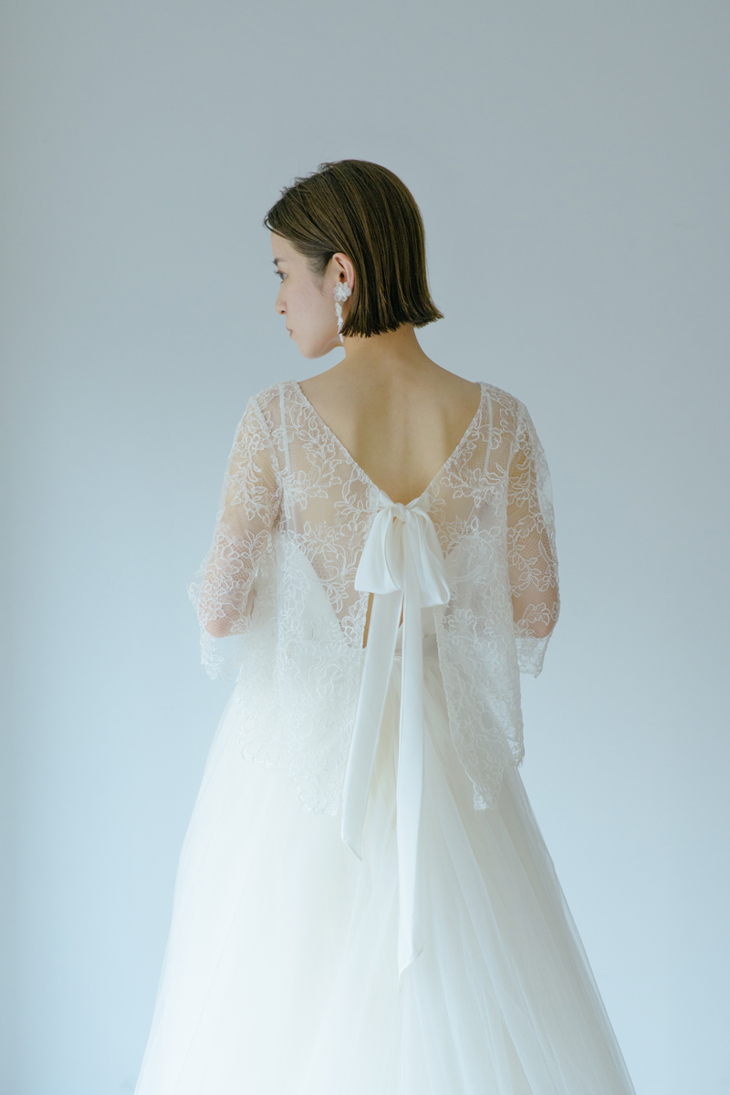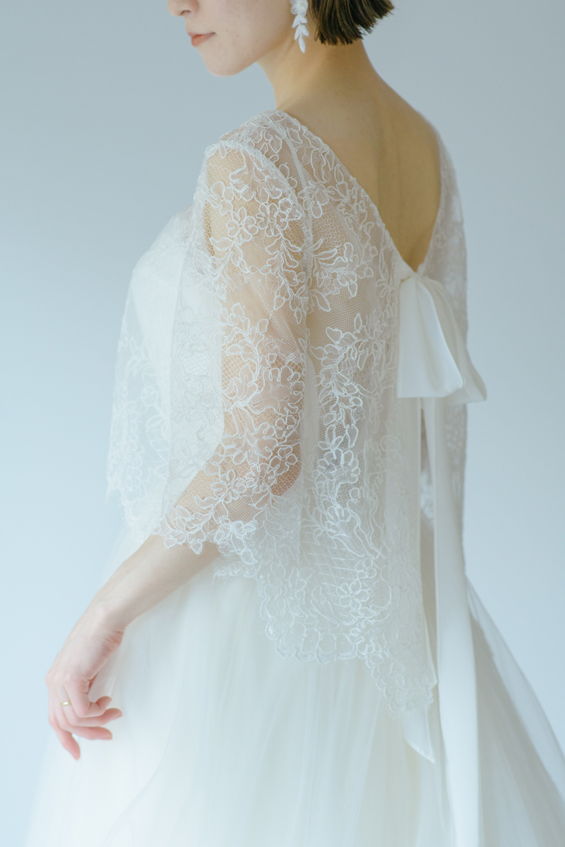 細いコードが刺繍されたレースは柄に陰影の出た綺麗な表情でアップで写すととても美しく、胸元や二の腕は肌の上にレースの柄が映りとてもエレガントな雰囲気です。後ろのリボンもポイントです。