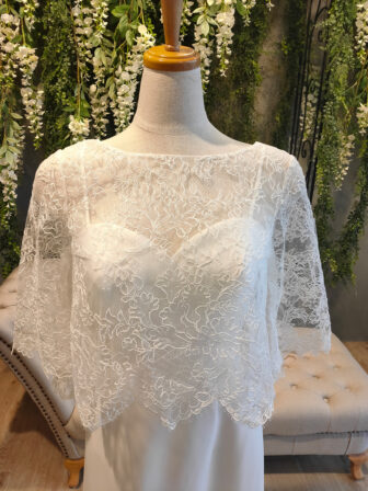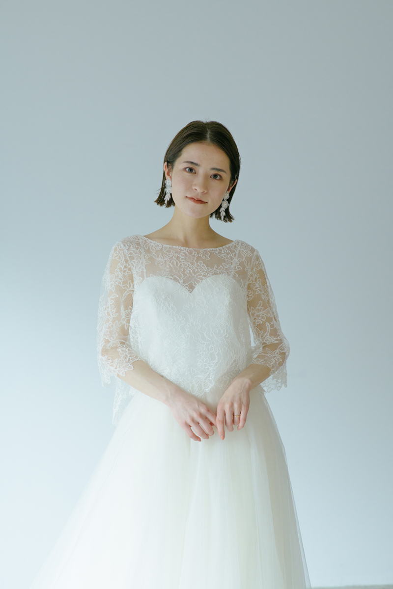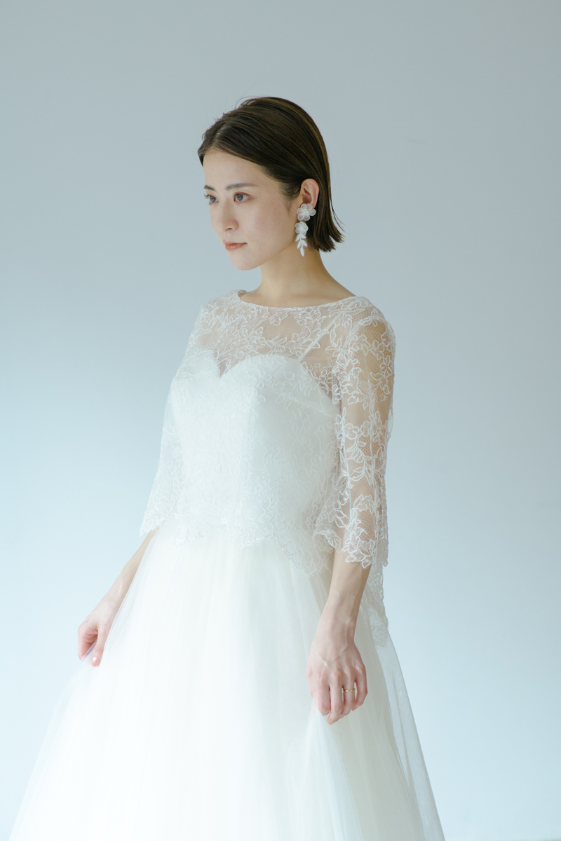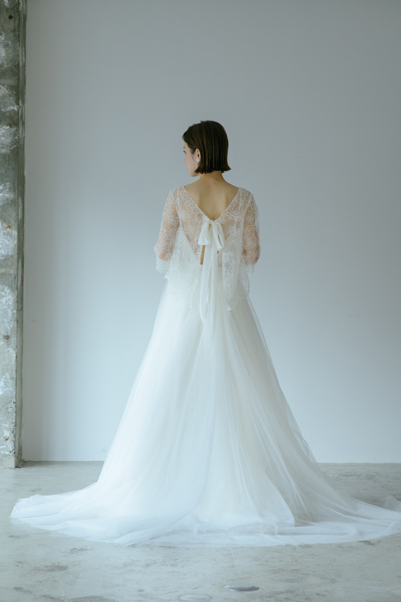 細いコードが刺繍されたレースは柄に陰影の出た綺麗な表情でアップで写すととても美しく、胸元や二の腕は肌の上にレースの柄が映りとてもエレガントな雰囲気です。後ろのリボンもポイントです。