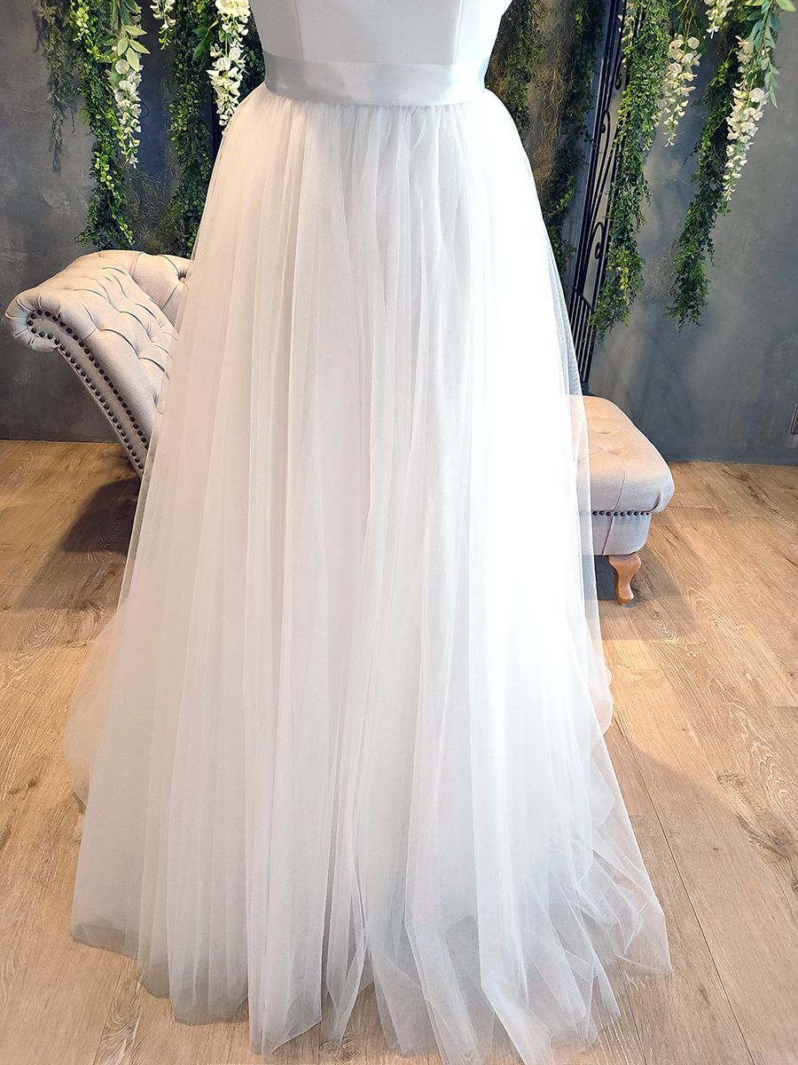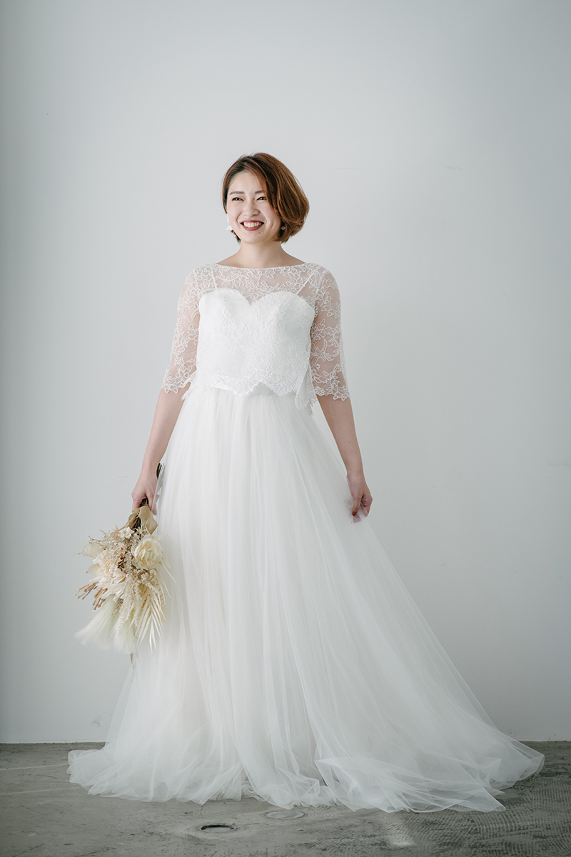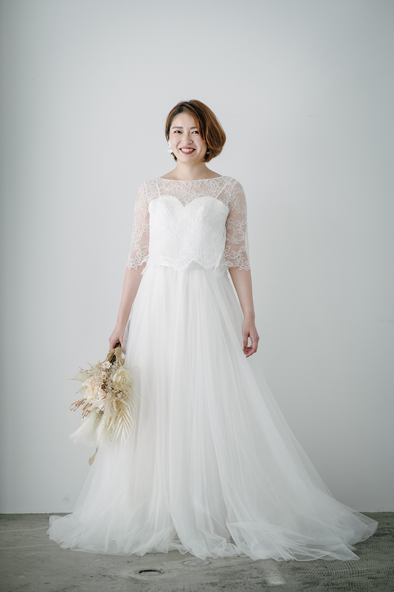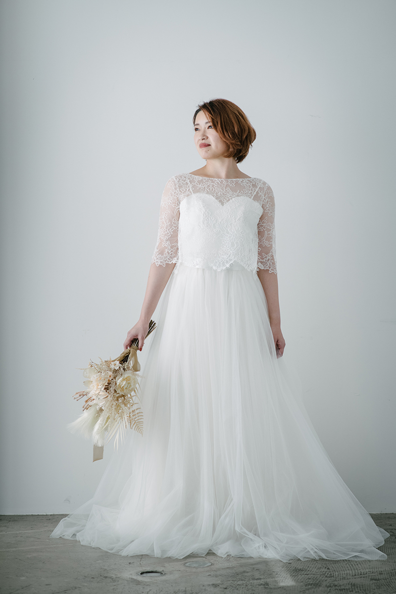 ベースドレスの上にレースのブラウスとチュールのオーバースカートを組み合わせています。