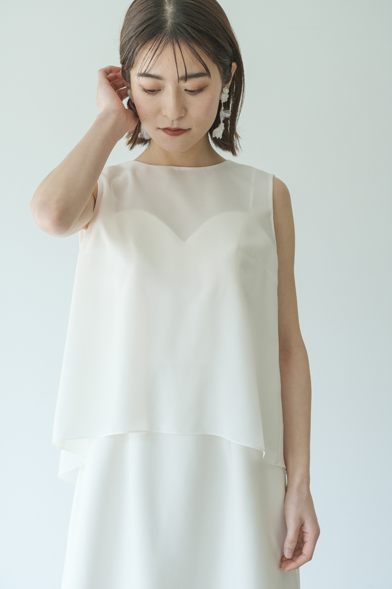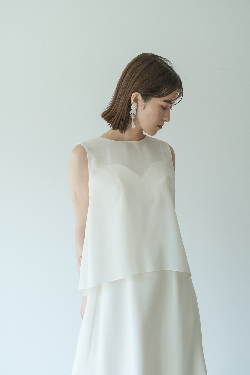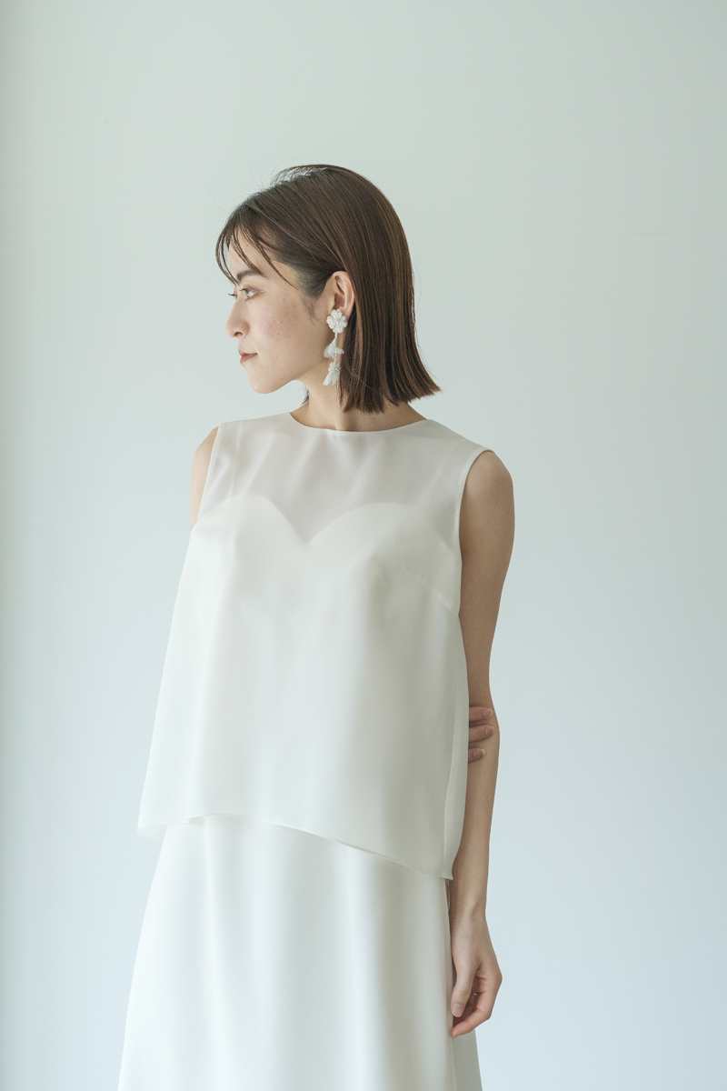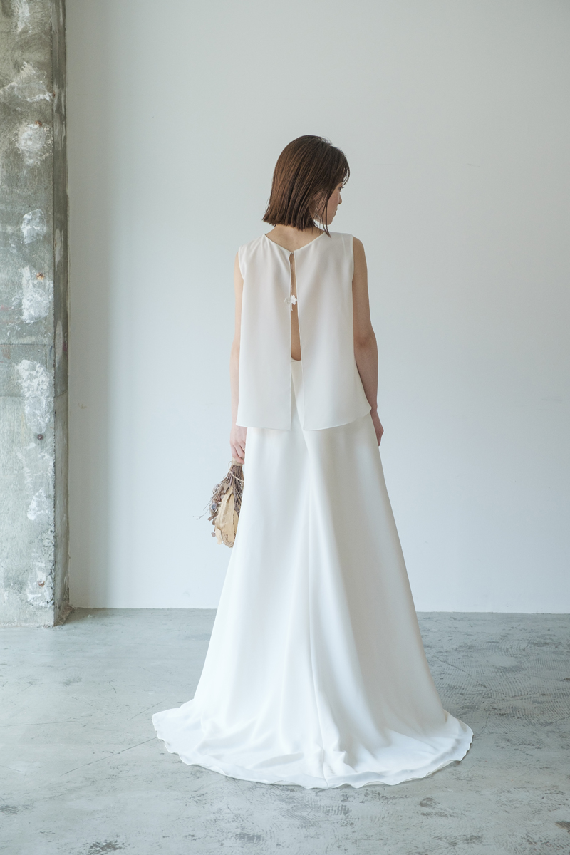 柔らかいツヤがあり、薄手ながらふっくらとしたトレンド感のあるデシン素材を使用しています。ハートカットの胸元と大きく開いた背中に広がりすぎないスカートのシルエットがスタイリッシュです。