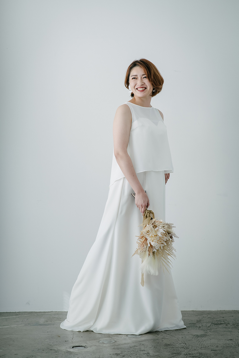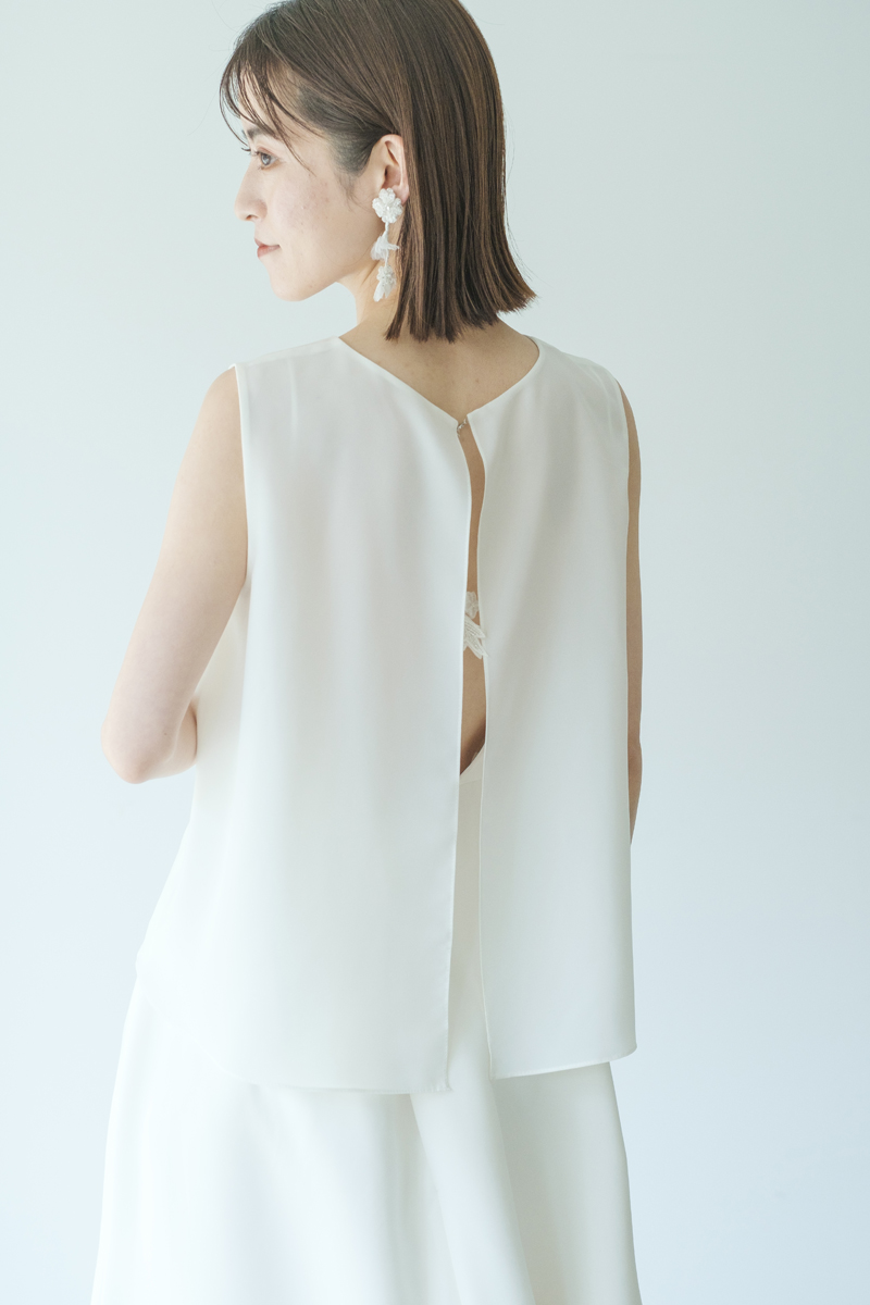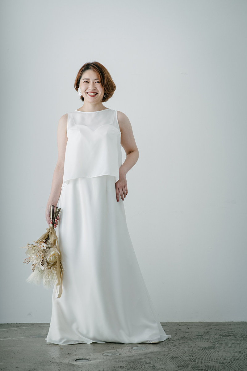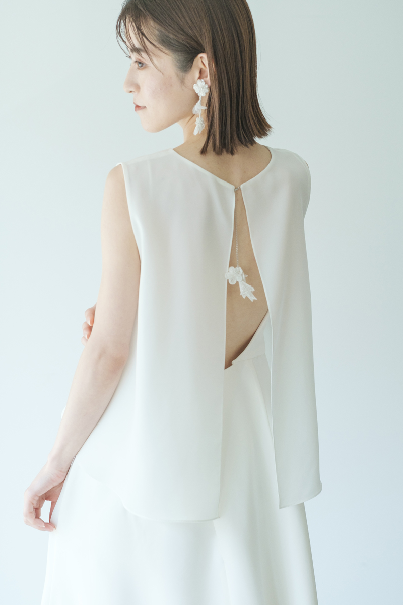 柔らかいツヤがあり、薄手ながらふっくらとしたトレンド感のあるデシン素材を使用しています。ハートカットの胸元と大きく開いた背中に広がりすぎないスカートのシルエットがスタイリッシュです。