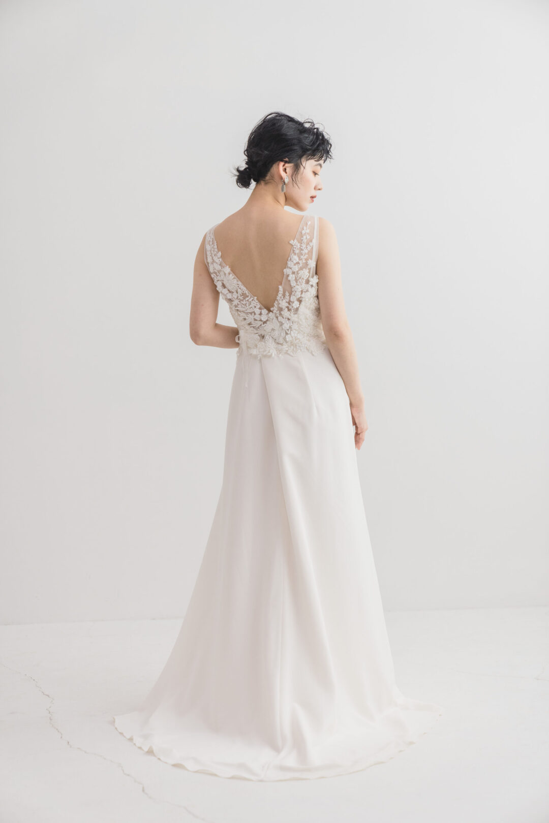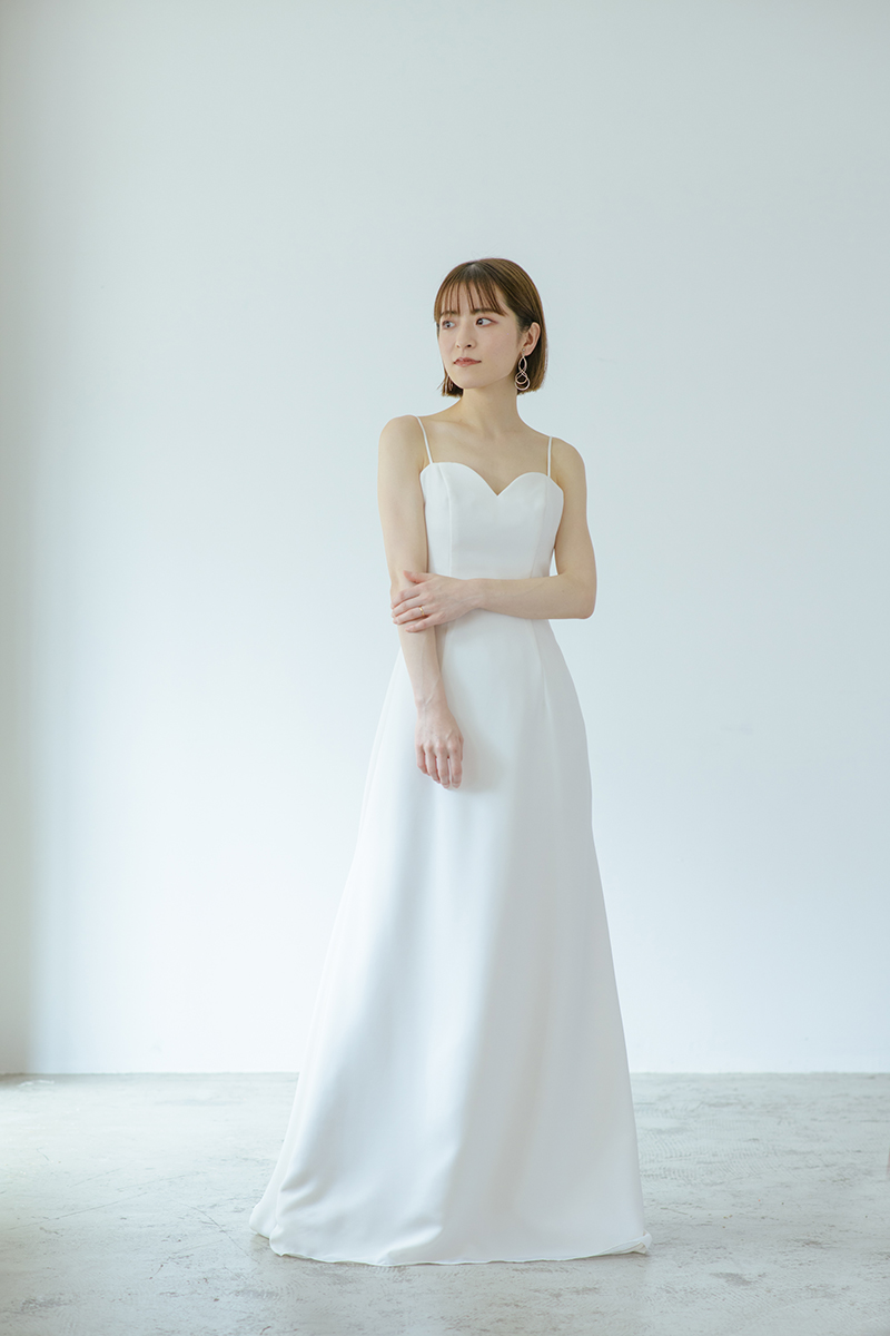 柔らかいツヤがあり、薄手ながらふっくらとしたトレンド感のあるデシン素材を使用しています。ハートカットの胸元と大きく開いた背中に広がりすぎないスカートのシルエットがスタイリッシュです。