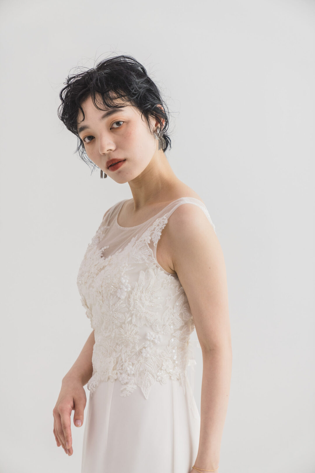 光沢のあるレーヨン糸で大小さまざまなお花モチーフを配置したレースです。レース上にあしらったビーズ刺繍はより立体的にモチーフを際立たせ、お写真映えのするデザインとなっております。肩先まで伸びるレースモチーフはよりお顔周りをスッキリと印象付け、トレンドのイリュージョンスリーブをイメージした着こなしが完成します。