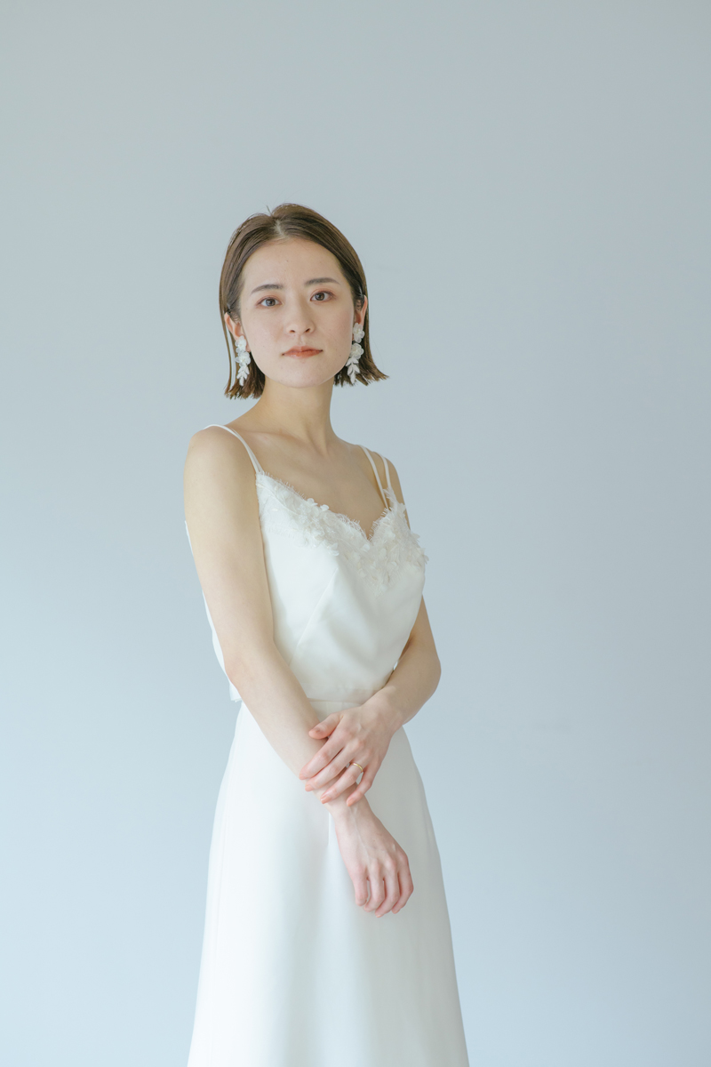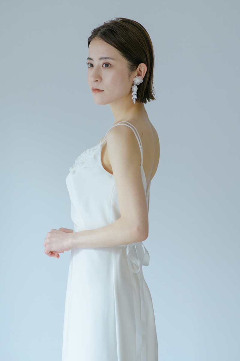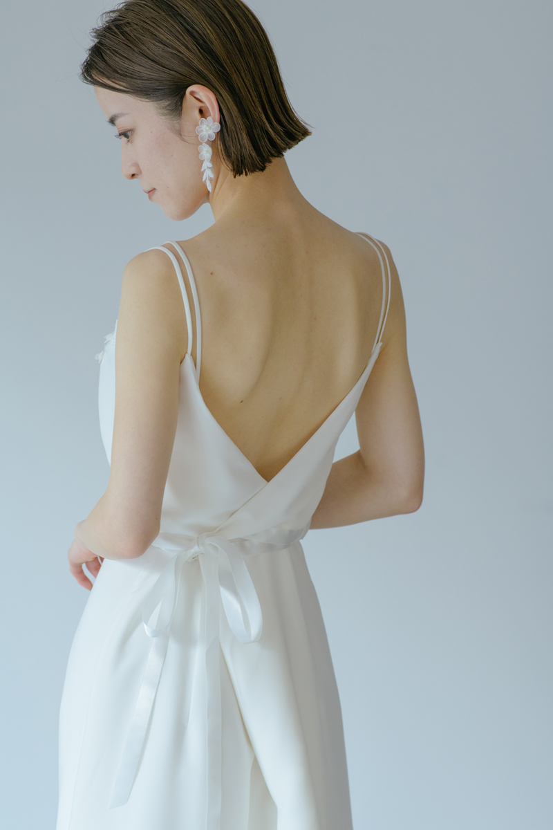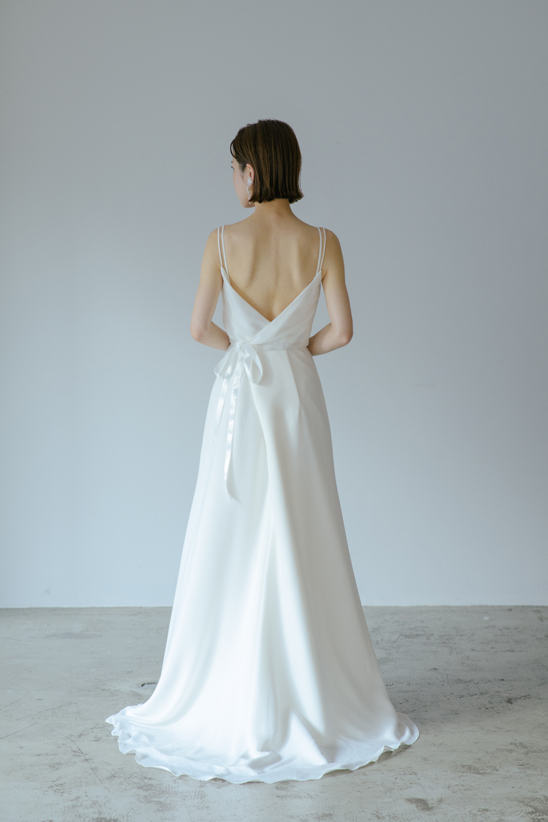 柔らかいツヤがあり、薄手ながらふっくらとしたトレンド感のあるデシン素材を使用しています。ハートカットの胸元と大きく開いた背中に広がりすぎないスカートのシルエットがスタイリッシュです。