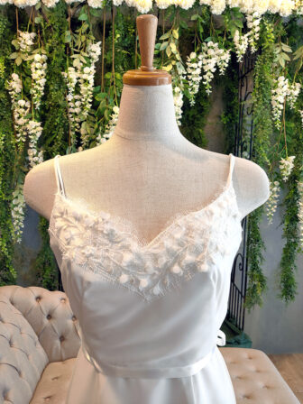 胸元のレースはアイボリーの糸で立体的な花びらが刺繍され上半身のアップ時にも顔元を華やかに彩ります。
