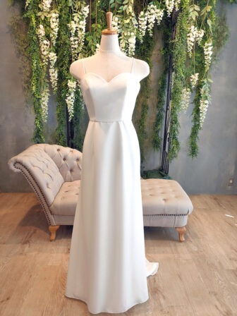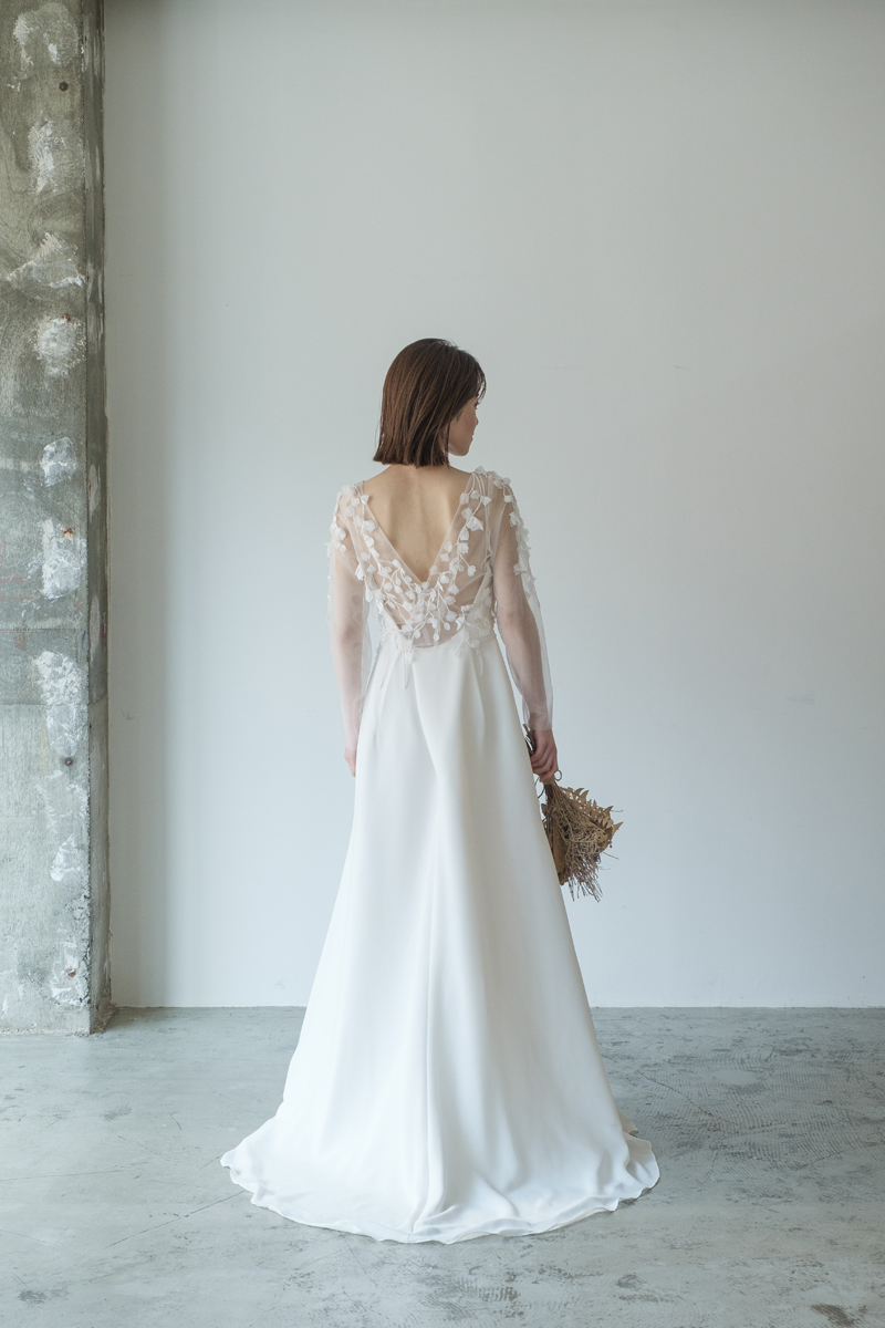柔らかいツヤがあり、薄手ながらふっくらとしたトレンド感のあるデシン素材を使用しています。ハートカットの胸元と大きく開いた背中に広がりすぎないスカートのシルエットがスタイリッシュです。